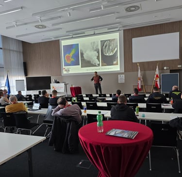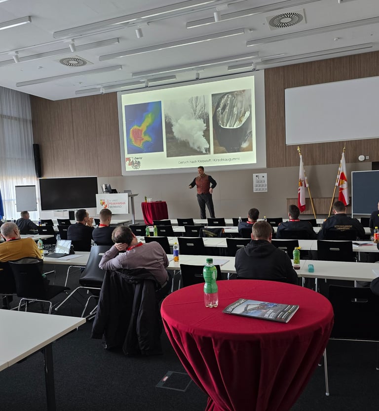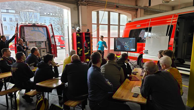 Optimierung der Einsatzleitung und der Stabsarbeit durch KI-Technologien für effizientere Entscheidungen und schnellere Reaktionen. Unser Foto zeigt ein Praxistraining zur KI-Anwendung in der Einsatzleitung im Rahmen der Internationalen Fachtagung 2025 im Chemiepark Linz.