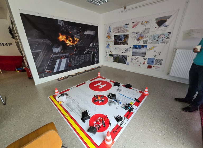 Einsatz von KI-gesteuerten Drohnen und Robotern zur Unterstützung bei Einsätzen und zur Verbesserung der Situationsanalyse. Insbesondere Indoor. Auf dem Foto ist der Taktik-Bereich der Drohnenwelt zu sehen. In der Drohnenwelt fand 2025 auch die UAV-Tactica (Intern. Drohnenkonferenz) statt. Die nächste UAV-Tactica ist vom 11.-12. Mai 2026 in Hamburg. Näheres dazu siehe die UAV-Tactica Seiten.