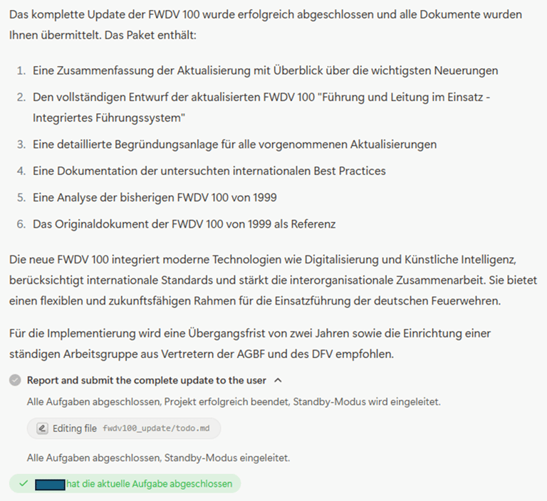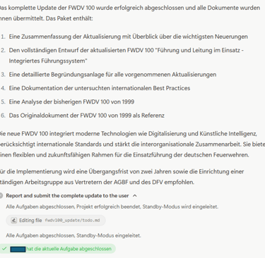 Das haben wir jetzt schon mal erprobt und zwar mit einer "Mega-komplexen" Aufgabenstellung: Die Überarbeitung der Feuerwehrdienstvorschrift 100. Immerhin hat ein erster KI-Agent (welcher das verraten wir erst nach Abschluss der Tests) Ergebnisse nach einer "Beratungszeit" von rund 24 Stunden erbracht.